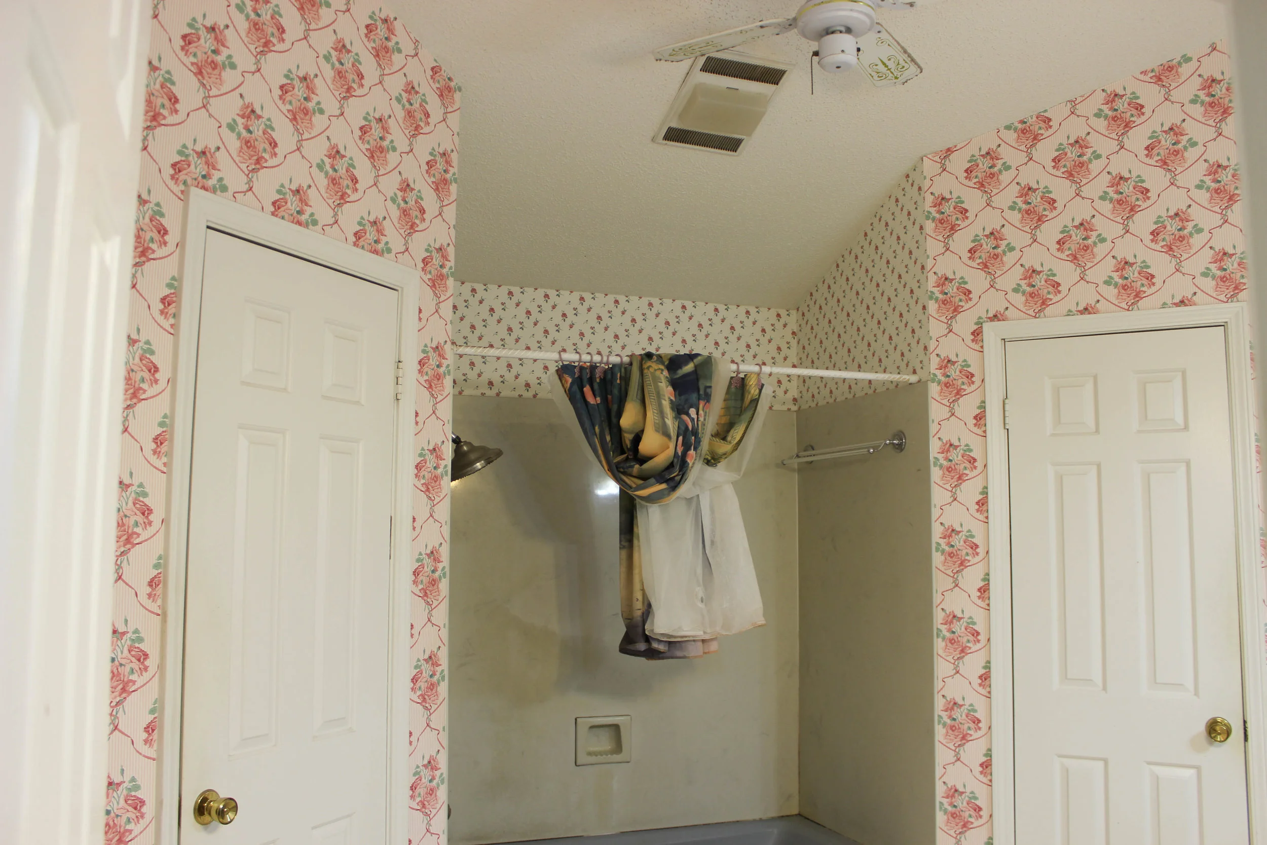 The wall color is Sherwin William's Wool Skein. this was in the original tiny white house and it's one of my go-to paint colors. I know grays are super in right now, but I've never been a big fan myself. they feel too cold for my taste. at the same time, I didn't want to paint everything white. I loved Wool Skein in our old house, so we decided to use it as our wall color throughout in this house. I love it, still; but it matches the natural color of canvas drop cloths almost exactly. I wanted there to be some contrast between my walls + drapes; so after doing some research, I decided to bleach mine to lighten and soften them. they say this gives them more of a linen look + feel, as well. so, I bought lots of bleach and got to work.